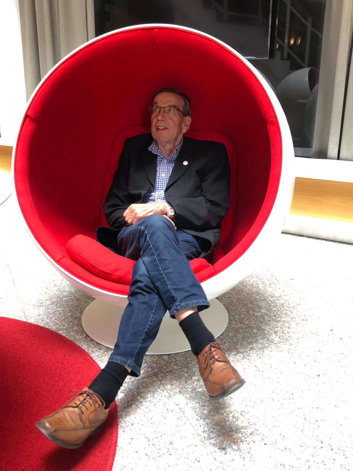 - Erkin oli pakko istahtaa retroistuimeen sisääntuloaulassa.