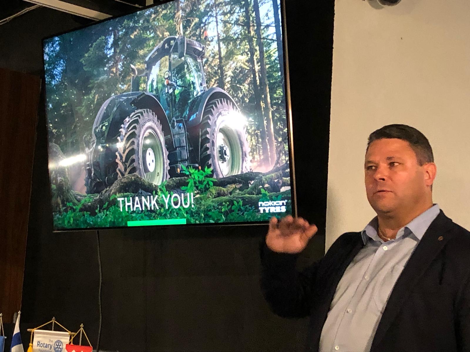 Presidenttimme Antti oli kutsunut Lempäälän Rotaryklubin vierailemaan viikkotapaamisessamme. Heitä saapuikin yli kymmenen rotaria presidentti Harri Nurmelan johdolla kuuntelemaan maanantain vierastamme Nokian Raskaat Renkaat yhtiön toimitusjohtaja Manu Salmen esitystä yhtiöistä. Hän toimii myös Nokian tehtaiden johtajana. Henkilöautojen renkaita valmistetaan Nokian lisäksi Dayton Tennesee Yhdysvallat ja Romanian juuri avatulla tehtaalla