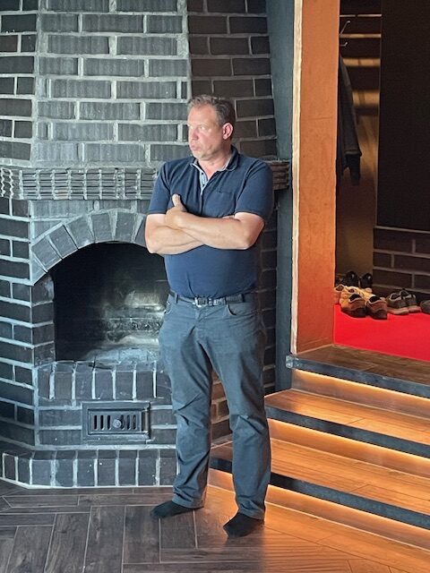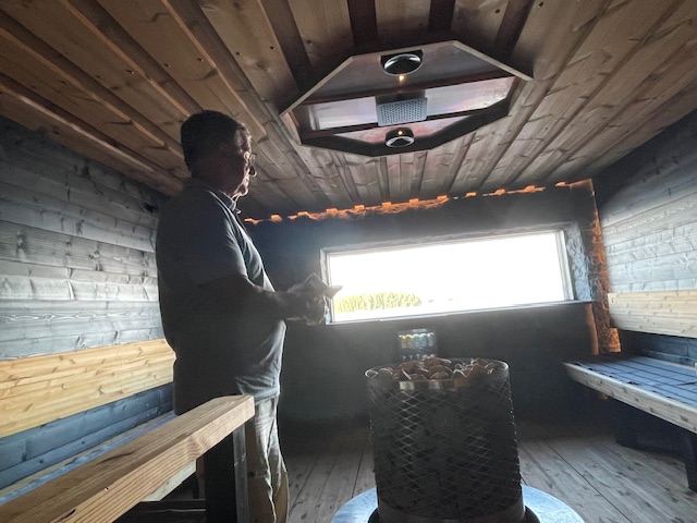 Jani Valtajärvi esitteli rakennuksen kaikki tilat. Ihan kaikki ei vielä ole valmiina, mutta sauna- ja kokoustilat, yläkerta ja alakerran pukuhuoneet ovat valmiita. Rantasaunasta puuttui vielä kiuas ja lauteet.