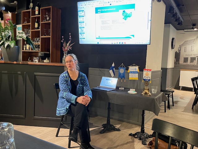 Vt.pääsihteeri Eeva Einola esitteli Vanajavesikeskuksen toimintaa. Heillä tehdään viiden henkilön voimin monipuolisia vesistön suojeluun ja parantamiseen liittyviä toimia ja hankkeita. Vanajavesikeskus toimii myös Rotareiden yhteistyökumppanina Vesireppu-hankkeessa Hämeenlinnassa ja meillä Akaassa.