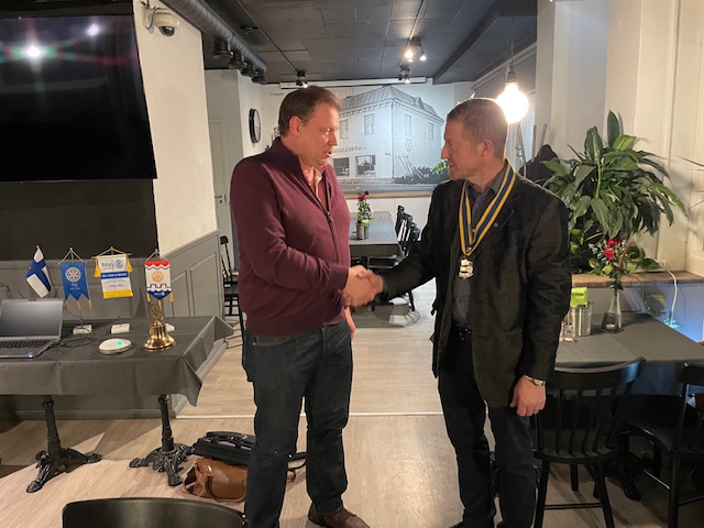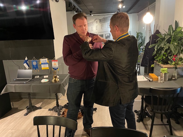 Kevätkausi klubissamme alkoi hienosti, kun uudelle jäsenellemme Jani Valtajärvelle presidentti Antti Veräväinen kiinnitti Rotaryn rintamerkin. Tervetuloa klubiin Jani!