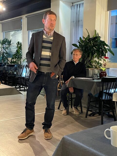 Toimintakertomukseen sisältyi paljon asiaa edellisestä kaudesta, joita Antti kävi läpi. Taustalla kokouksen pj. Eero Virtanen.