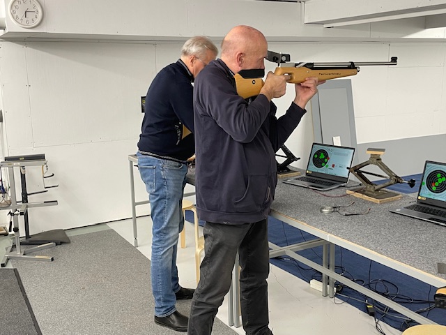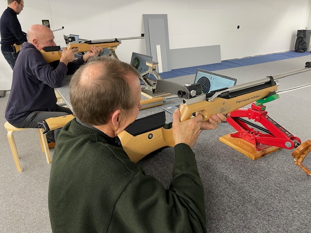 Kahvin juonnin lomassa kuulimme Rainer Hirvosen kertomana seuran tekemisestä ja urheiluammunnasta yleensä. Rainer kävi läpi ammuntaan liittyvät turvaohjeet huolellisesti läpi, jonka jälkeen pääsimme kokeilemaan itse ammuntaa. Käytettävissämme oli viisi seuran ilmakivääriä ja yksi pistooli. Osallistujajoukollamme taisi kaikilla olla jonkinlaista kokemusta ammunnasta armeijan leivissä käytetyn rynnäkkökiväärin lisäksi.