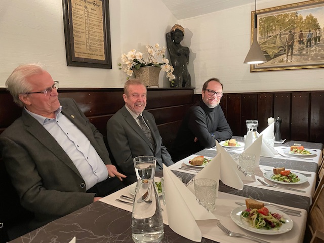 - Vanhan Rauman Kellarissa nautittiin alkajaisiksi lounasta. Schnitzel olivat melkoisen kookkaita ja maukkaita. Vas. Reijo, Rainer ja Timo.