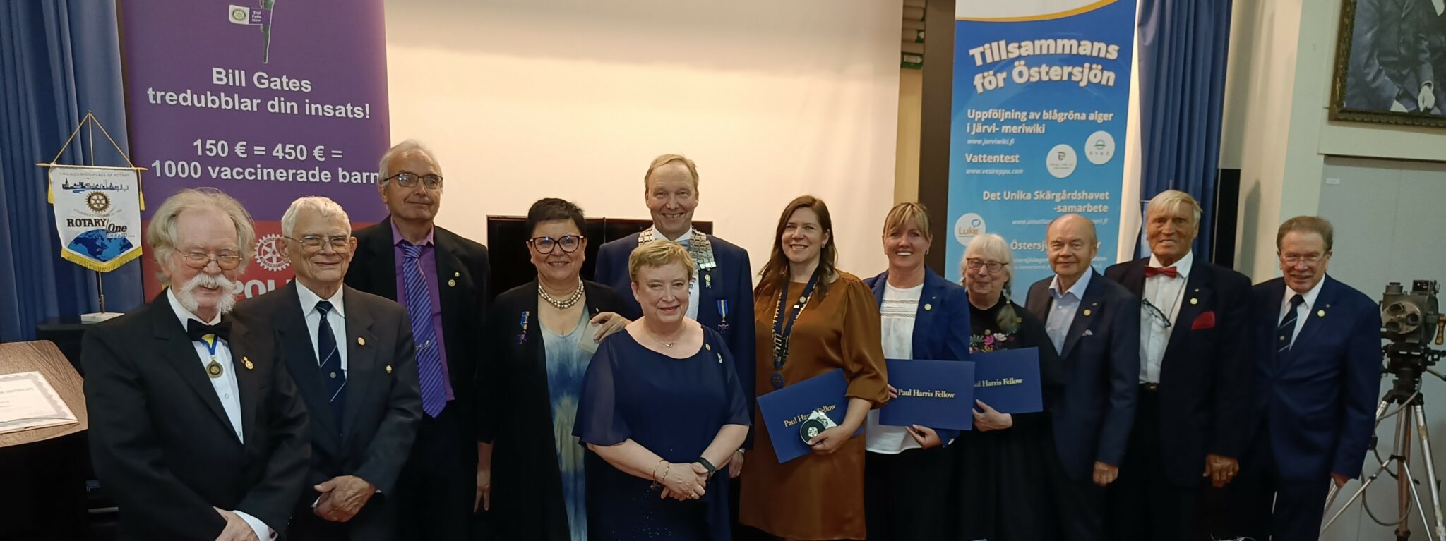 Illan aikana tervehdyksiä vastaanotettiin Godby Rotaryklubin kummiklubilta, Maarianhaminan Rotaryklubilta sekä ystävyysklubeilta Järfällan Rotaryklubilta Ruotsista ja Samppalinnan Rotaryklubilta Suomesta. Maittavan buffetin jälkeen oli Paul Harris -huomionosoitusten vuoro.