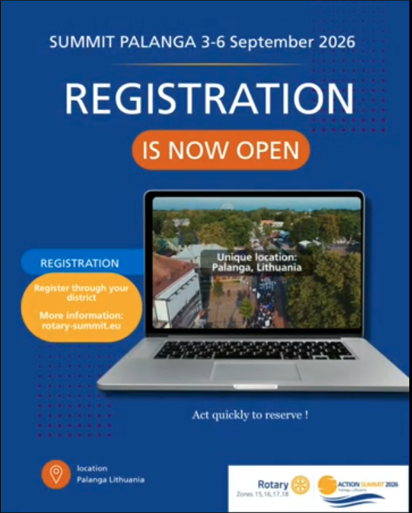 Rotary Action Summit 2026 järjestetään 3.–6. syyskuuta Palangassa, Liettuassa. Kokoonnutaan ainutlaatuiseen lomakohteeseen, joka tunnetaan hiekkarannoistaan ja dyynistään, hyvinvointipalveluistaan, kesän viihdetarjonnastaan sekä Paul P. Harrisin patsaasta. Täällä saadaan kotiinvietäväksi inspiraatiota loistavilta puhujilta ja tärkeistä keskustelunaiheista.