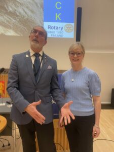 Presidentti on ennen kaikkea arvojohtaja. Johtajuutta osoitetaan hankalissa tilanteissa, kun Presidentin Esimerkki Laukaisee Solmun. Klubin keulakuvana Presidentti Edistää Luomaan Suhteita, mutta yhtä lailla jokaisen rotarin tulee mieltää tämä tehtävä. Siitä kuinka kansainvälinen toiminta voi rikastuttaa jokaisen rotarin elämää kertoi meille Rotary Internationalin tuleva johtaja Soffia Gisladottir. Soffia avasi oman kautensa piirien vierailut tulemalla ensimmäiseksi Lietoon. Kunnianosoitus piirillemme! Onnea Soffialle tehtävään!