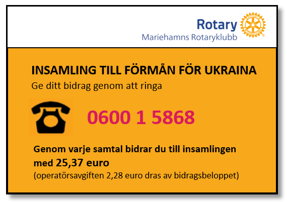 Ukrainan väestö kärsii sodan seurauksena. Maarianhaminan Rotaryklubi teki Ahvenanmaalla keväällä 2022 laajan keräyksen Ukrainan hyväksi, mutta koska Venäjän hyökkäykset vain jatkuvat lisäapua tarvitaan. Tästä syystä Maarianhaminan Rotaryklubi aloitti uuden suuren varainkeruun helmikuussa 2023, jonka tavoitteena on auttaa pakolaisia ja apua tarvitsevia Ukrainassa.
