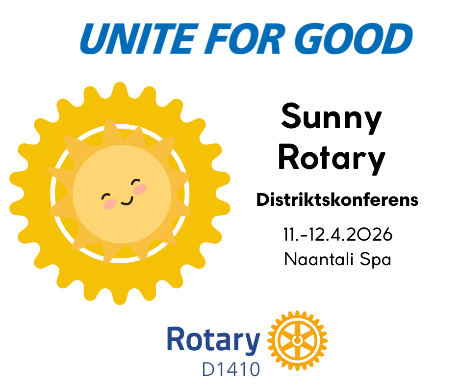 Vårens distriktskonferens, SUNNY ROTARY, kommer att hållas på Spahotell Naantali i Nådendal 11–12 april 2026 och evenemanget är öppet för alla. Jag uppmuntrar er att delta. Markera datumet i er kalender; anmälan öppnar i slutet av januari.