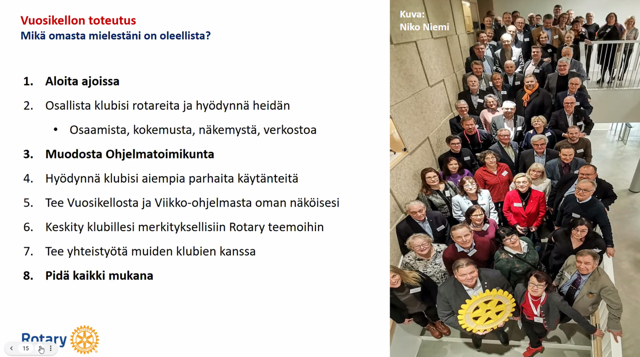 Liisa välitti piirikuvernööri Jere Jantusen terveiset. Jere totesi, ’mitä paremmin suunnittelet klubisi toimintaa, sitä helpompi on toimia’. Hauskaa saa olla. ’Rotary is fun’, summasi Jere.
