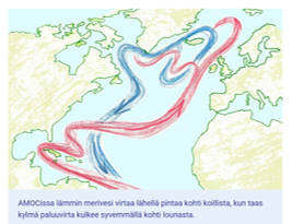 Finlands klimat påverkas starkt av den nordatlantiska cirkulationen, kallad AMOC (Atlantic Meridional Overturning Circulation). Den drivs av vindar och skillnader i vattnets densitet. Varmt ytvatten nära ekvatorn strömmar norrut och avger värme till atmosfären, vilket gör vattnet tätare så att det sjunker mot djupet. Samtidigt strömmar kallt vatten från norr söderut närmare havsbotten.