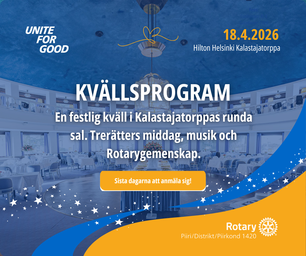 Vår konferens kulminerar i en kvällsfest som börjar kl. 18.00 i Kalastajatorps runda sal, där vi njuter av en trerätters middag, program, musik och dans samt den fina gemenskapen bland rotarianer.