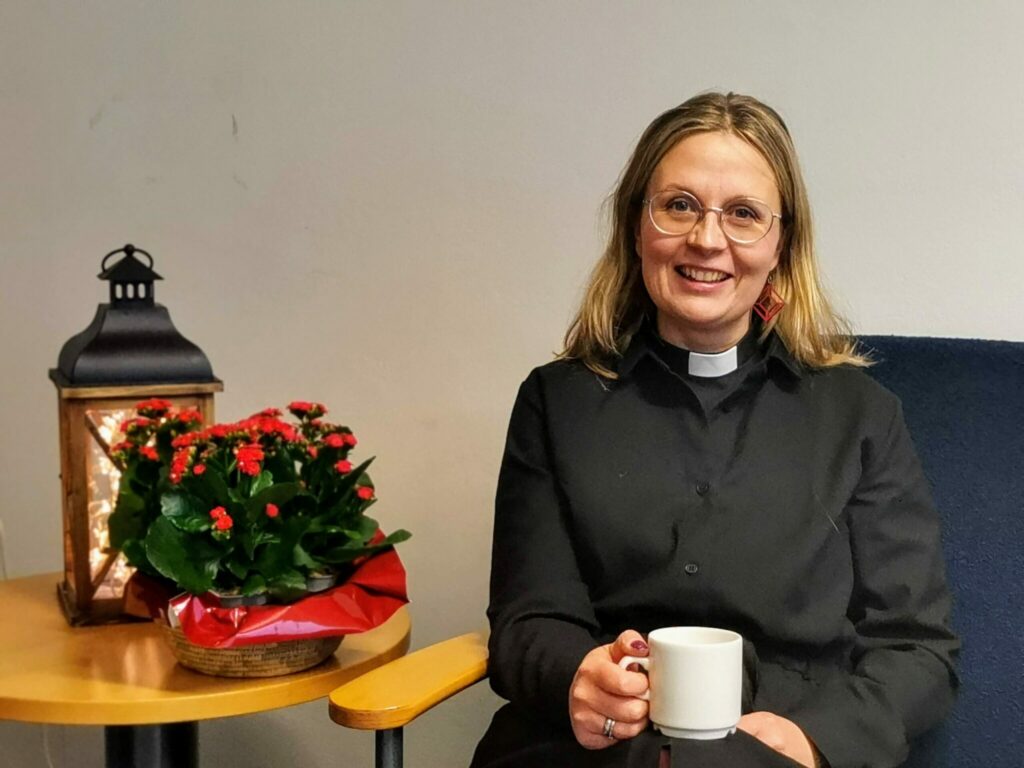 Kirkkoherra Hanna-Leena Kevätsalo-Vuorion isännöimä joululounas seurakuntakeskuksessa.