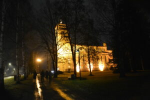 Taulumäen kirkko 20.12.2025 vesisateessa, harvoin kauneimpien joululaulujen aikaan.