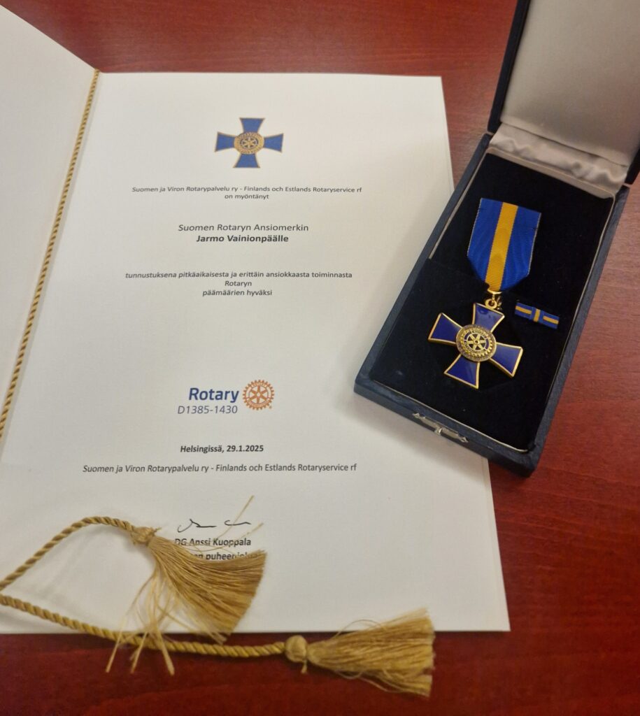 Klubiveljemme Jarmo Vainionpää sai maaliskuussa vastaanottaa Suomen Rotaryn ansiomerkin tunnustuksena monivuotisesta työstä piirin 1385 tiedotuksen ja nettinäkyvyyden parissa.