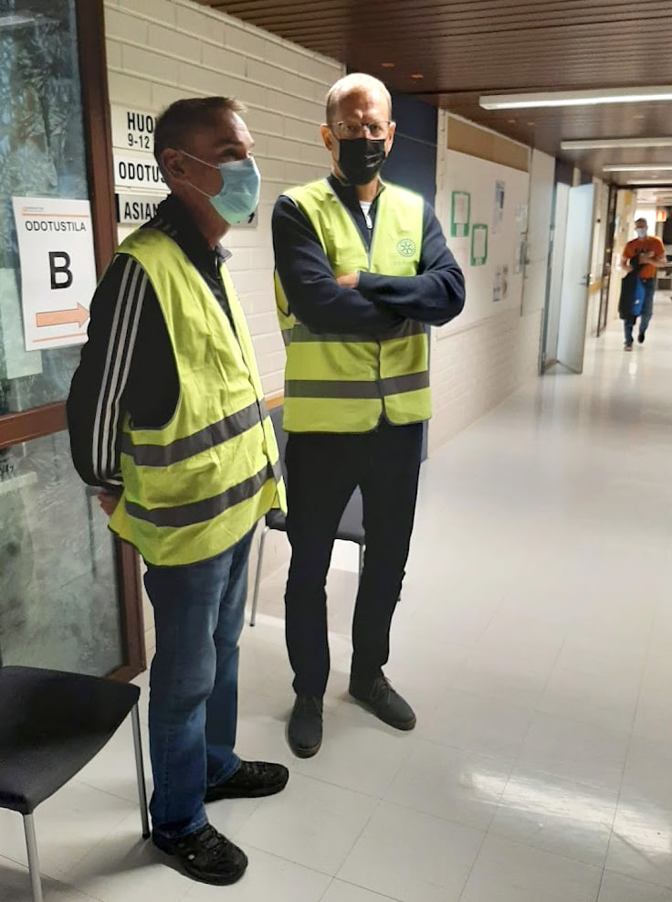 Sosiaali- ja terveyskuntayhtymä Kaksineuvoinen järjesti koronan massarokotuspäivän 12.6.2021. Talkoilimme siellä sekä parkkipaikan että sisätilojen opastajina. Kun normaalien asiakkaiden lisäksi reilut 500 kauhavalaista kävi päivän mittaan hakemassa koronapiikin, niin kahdeksan hengen talkooporukkamme oli kyllä täystyöllistetty ja tarpeellinen. Keväällä alkanut yhteistyömme terveyskuntayhtämä Kaksneuvoisen rokotuspäivien avustajina jatkui. Syyskuussa hoidimme avoimena koronan massarokutuspäivänä 4.9 Kauhavan terveyskeskuksella liikenteen ohjausta ulkona parkkipaikoilla sekä ihmisten ohjausta ja rokotettujen valvontaa sisätiloissa.
