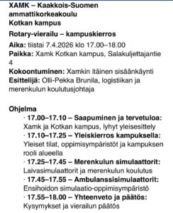 Vierailu Xamk Kotkan kampuksella8.4.2026Klubimme osallistui Kotka-Langinkosken Rotaryklubin järjestämään mielenkiintoiseen tutumisvierailuun Xamkissa 7.4.2026.