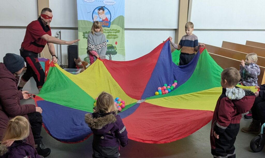 SuperSamin johdolla leikittiin värikkään laskuvarjon kanssa.