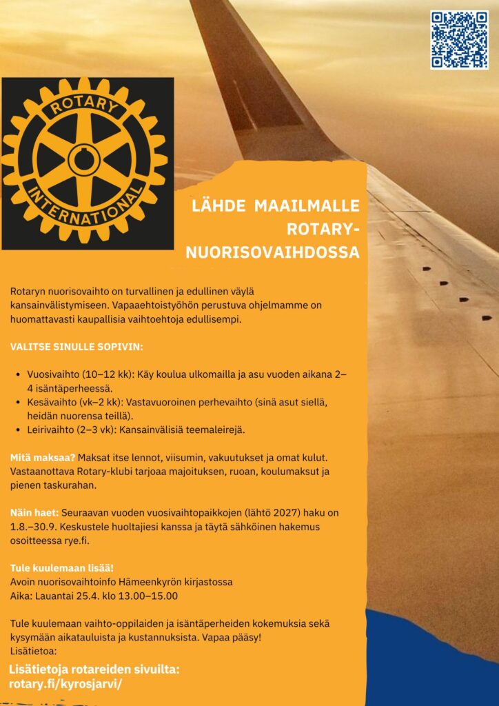 Lauantaina 25. huhtikuuta 2026 järjestimme Hämeenkyrön kirjastossa avoimen nuorisovaihtotapahtuman. Paikalle saapui ilahduttavasti nuoria ja heidän vanhempiaan kuulemaan, kuinka Rotary mahdollistaa turvallisen tavan tutustua maailmaan.