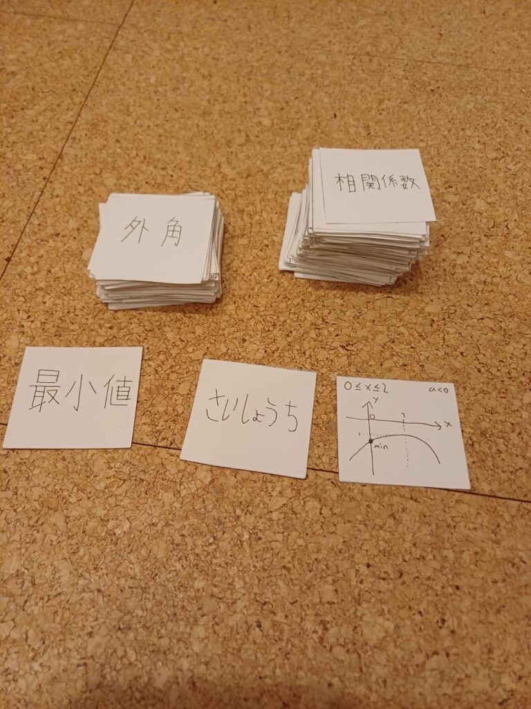 Olen tehnyt muistipelikortit matematiikan opiskelua varten, kemia on työn alla. Kyseisessä pelissä on kolmen kortin setit. Yhdessä kortissa on kanji, yhdessä kortissa lukutapa ja yhdessä kortissa sanan merkitys, yleensä kuvan tai lausekkeen avulla.
