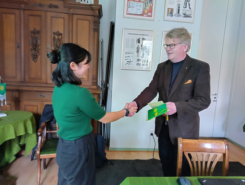 Kokouksen aluksi vaihto-oppilaamme Asuka Kono luovutti lähettäneen klubin viirin ja kirjeen, sekä saimme Meksikosta vaihto-oppilaamme Aiko Jaakonsaaren tuoman hänen isäntäklubinsa viirin.