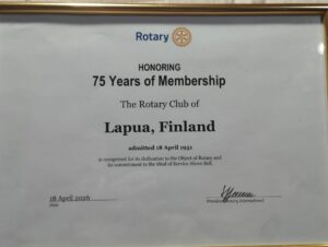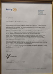 Piirikuvernöörin Timo Kokkola välitti Rotary Internationalin presidentti Franseco Arrezzon onnittelut 75 vuotta täyttävälle Lapuan Rotaryklubille. Dokumentin vastaanotti Erkki Ketola Hieno muistaminen.