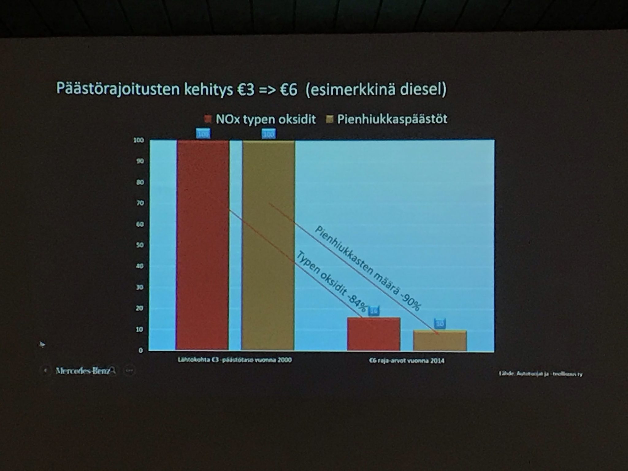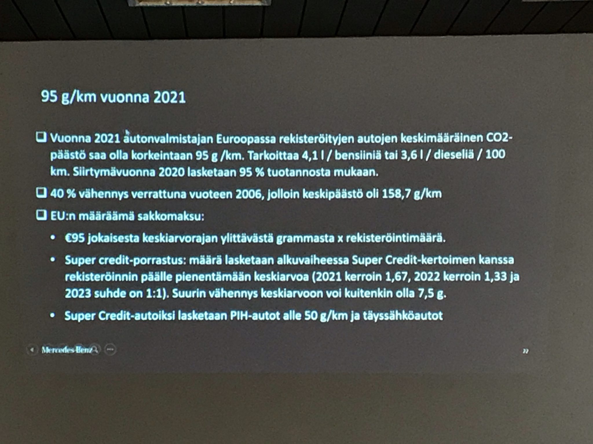 Johtaja, Pertti Nieminen, Vehosta avasi meille autoalan tulevaisuuden näkymiä. Mielenkiintoinen tieto oli autonvalmistajien energiatehokkuutta kirittämään laadittu sakollinen päästöraja 95 g/km. Valmistaja maksaa 2021 rekisteröidyistä autoista sakkoa jokaisesta keskiarvorajan ylittävästä grammamasta rekiströityjä autoja vastaavan määrän. Siitymä vuonna 2020 lasketaan 95% tuotannosta mukaan.
