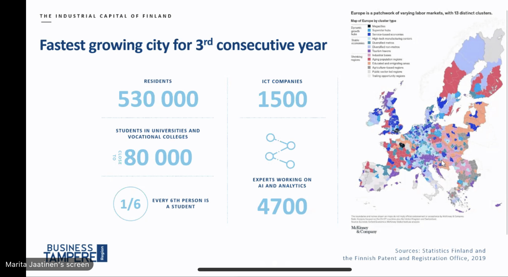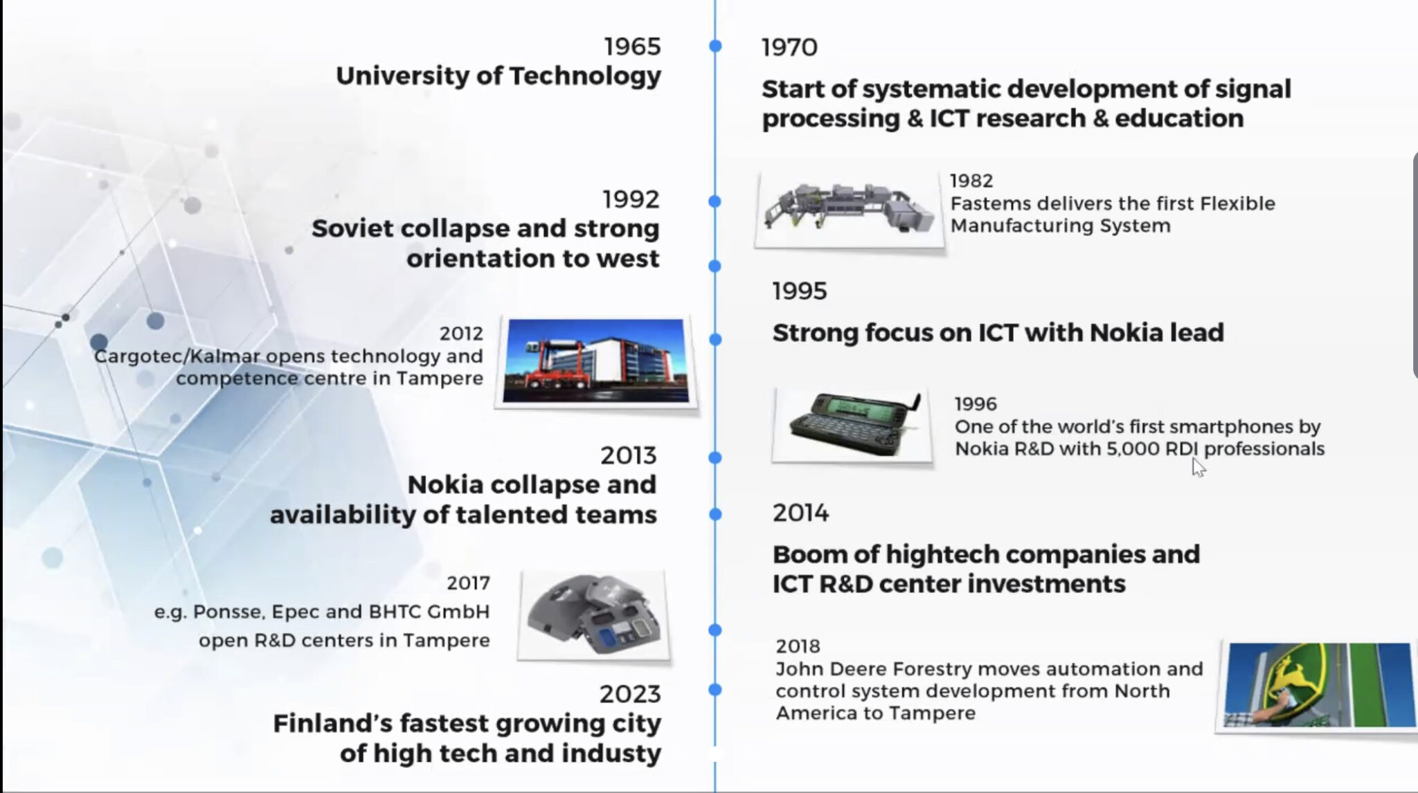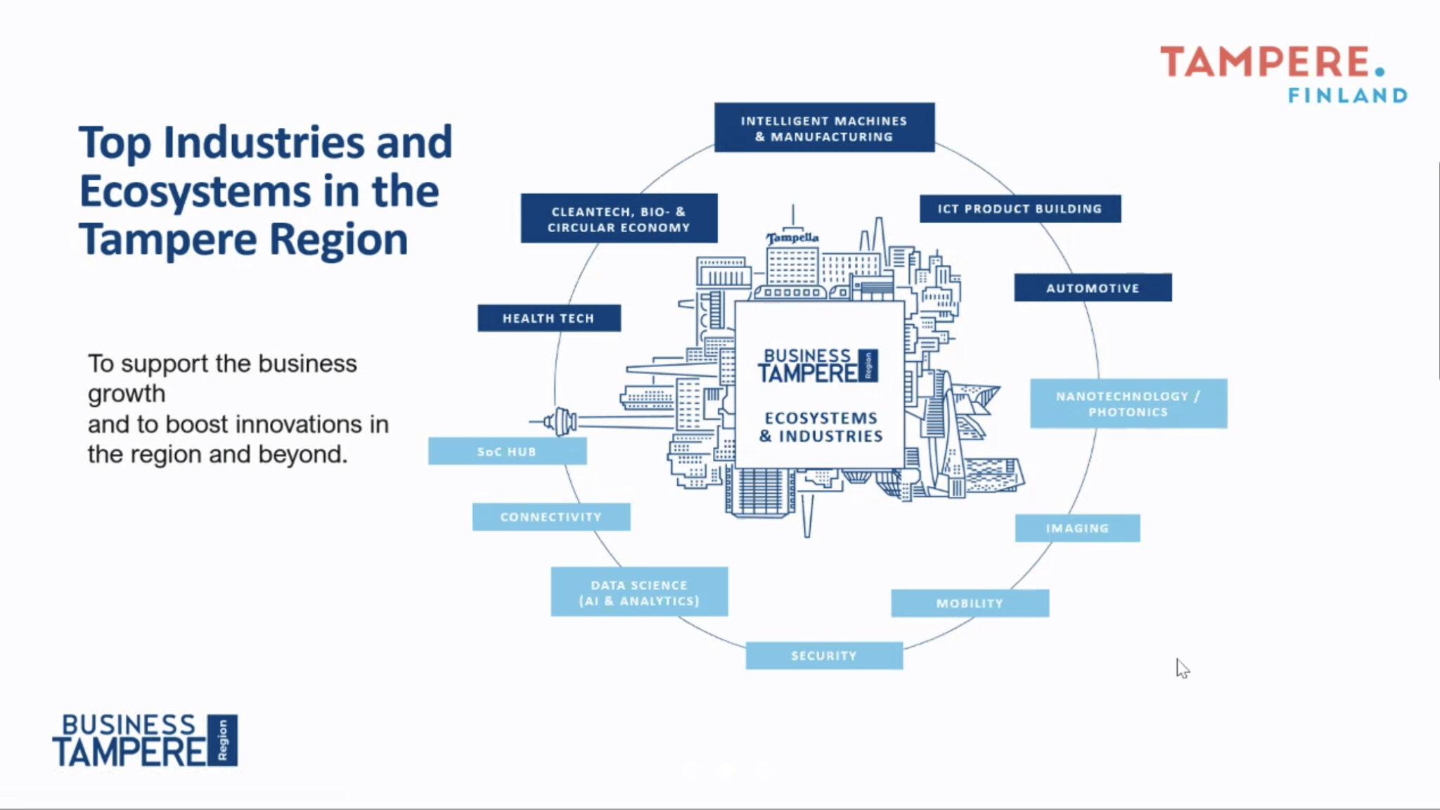 Tampereella vahva teollinen historia. Menestyksen tekijöitä ovat ekosysteemit ja klusteriyhteistyö. Vahva merkitys on kasvavan kaupungin kyvykkyys vastaanottaa uusia tekijöitä sekä teollisuuden ja koulutuksen linkittyminen.