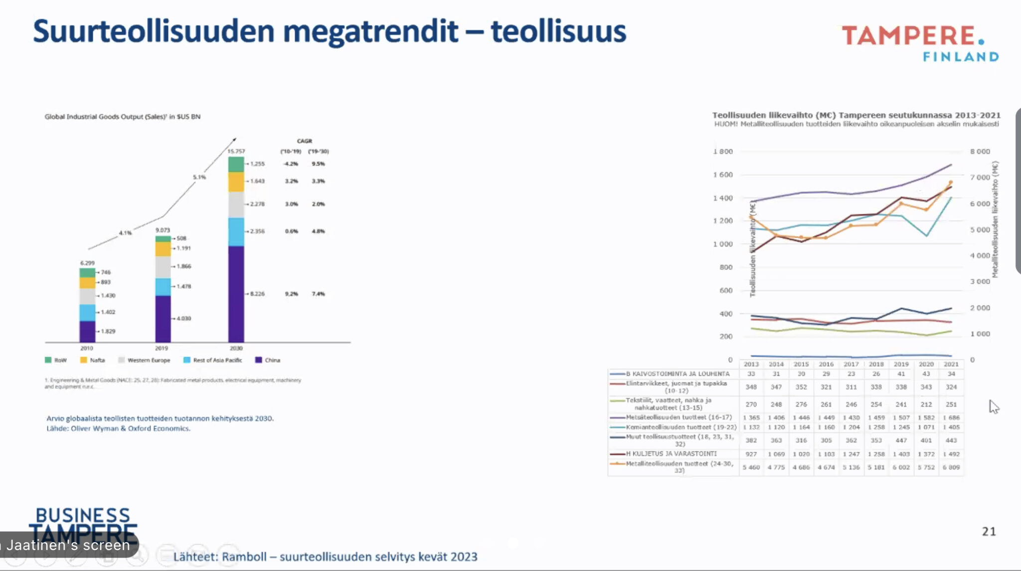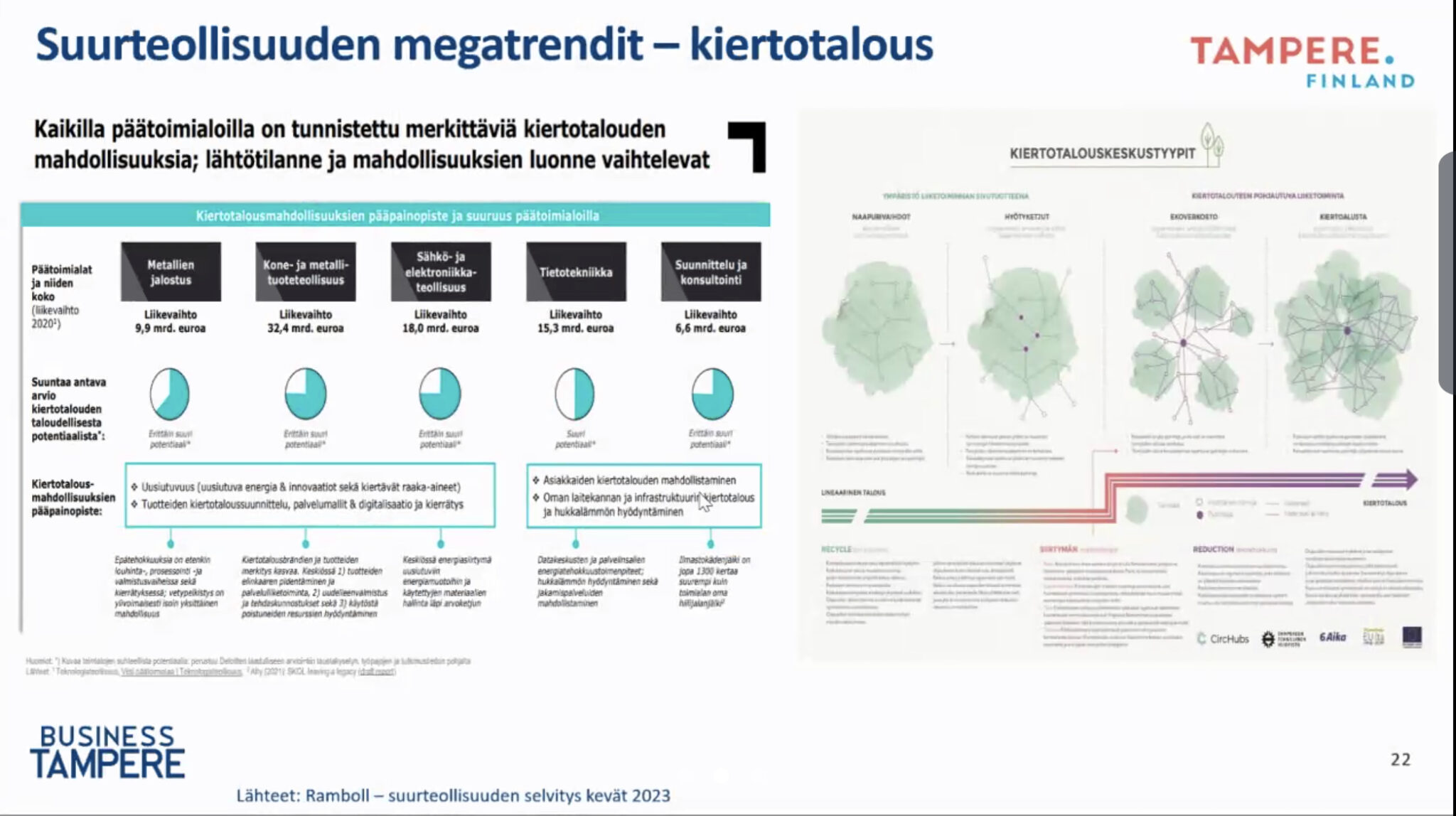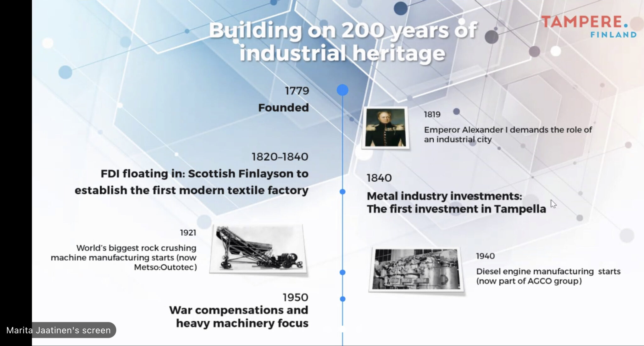 Tampereella vahva teollinen historia. Menestyksen tekijöitä ovat ekosysteemit ja klusteriyhteistyö. Vahva merkitys on kasvavan kaupungin kyvykkyys vastaanottaa uusia tekijöitä sekä teollisuuden ja koulutuksen linkittyminen.