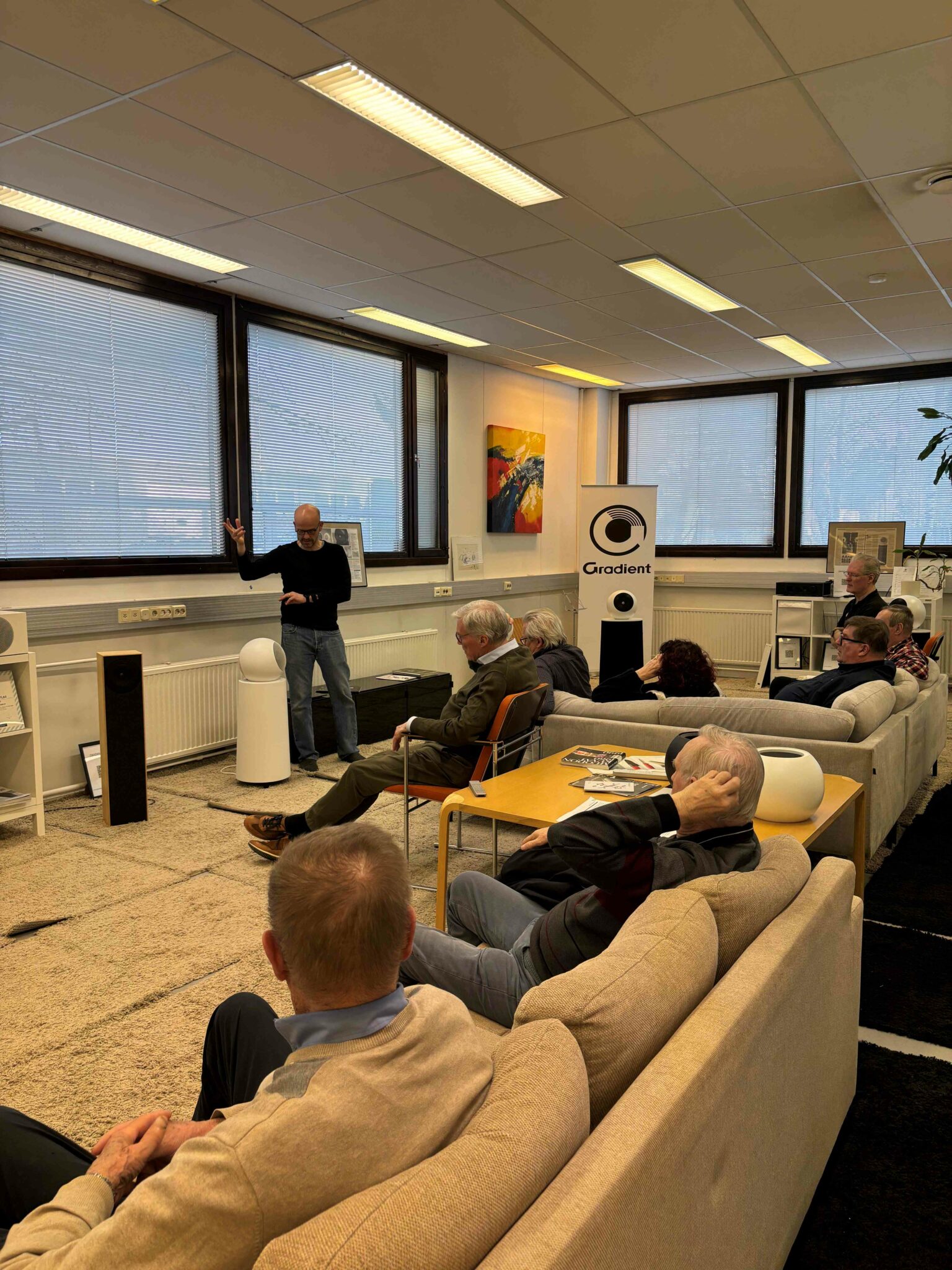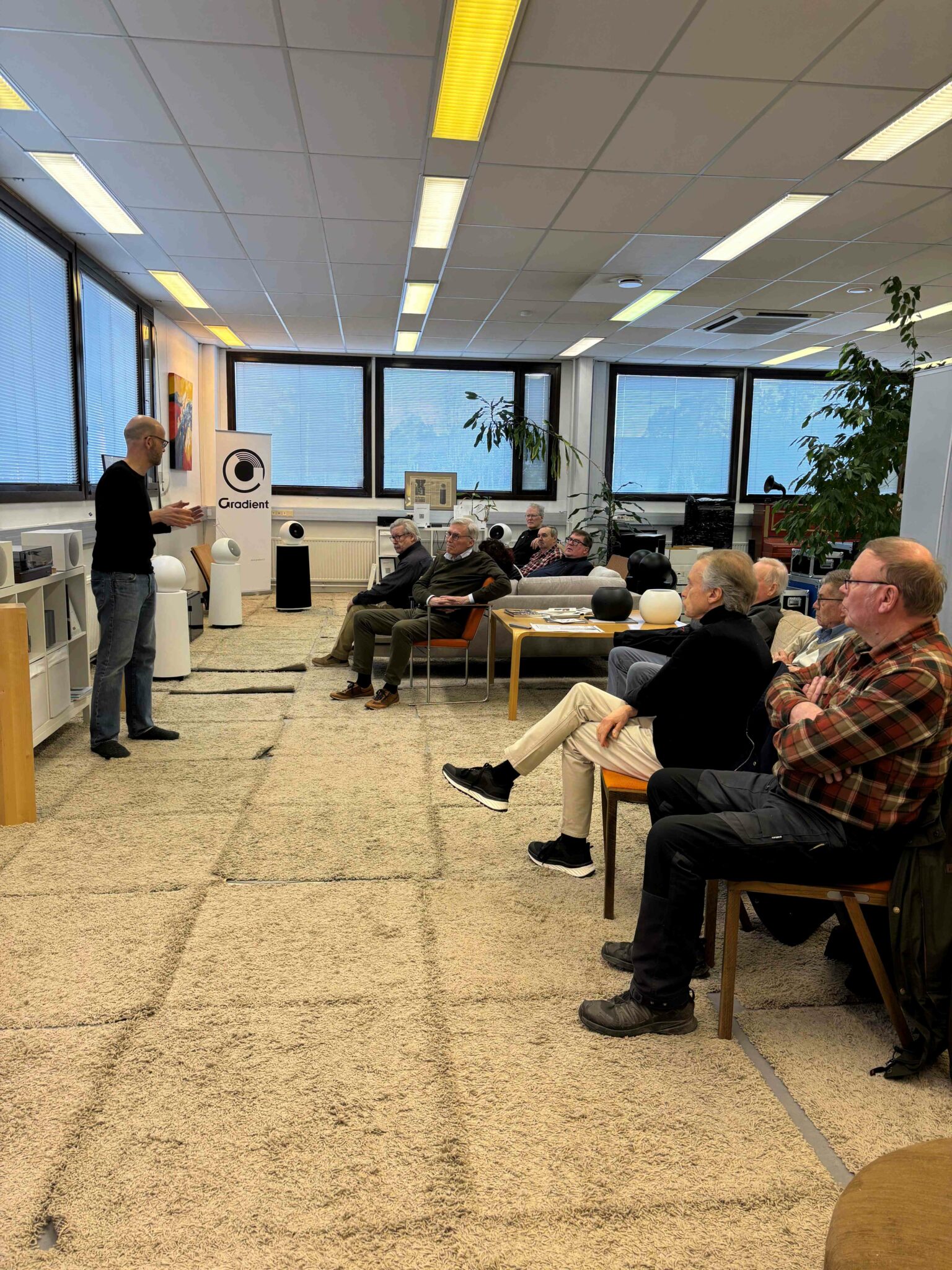 15.2.2026 Tänään tutustuimme Porvoossa suomalaiseen tunnettuun huippuluokan kaiutinvalmistajaan nimeltä Gradient. Yrityksen on perustanut ja maailmallakin hyvin tunnetut tuotteet on kehittänyt edesmennyt Jorma Salmi. Meille yritystä esitteli hänen poikansa Atte Salmi, joka osti yrityksen vuonna 2010. Kuulimme Gradientin kehityshistoriaa ja kuulimme myös musiikkinäytteitä eri kaiuttimista, niin vinyyleinä kuin digitaaliversioinakin. Kaiuttimien äänenlaatu näytti tekevän vaikutuksen 12 vierailijaan.