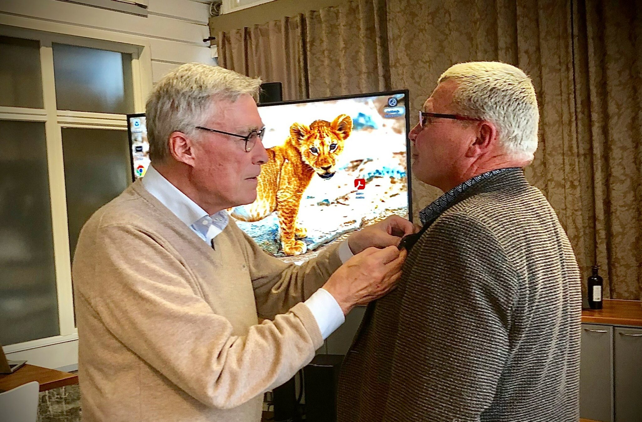 Presidentti Mikko Simolinna luovutti uudelle jäsenelle rotarymerkin. Saajana oli Harri Krakau.