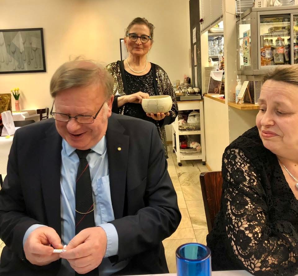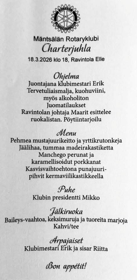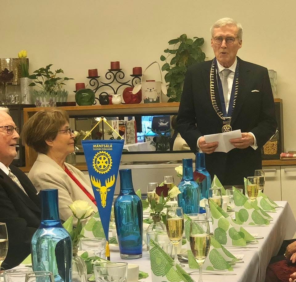 Mäntsälän Rotaryklubin Charterjuhlaa vietettiin Ravintola Ellessä. Yksi pitkä pöytä odotti kahtakymmentä juhlijaa. Juhlassa oli mukava tunnelma ja ilta sujui rattoisasti.