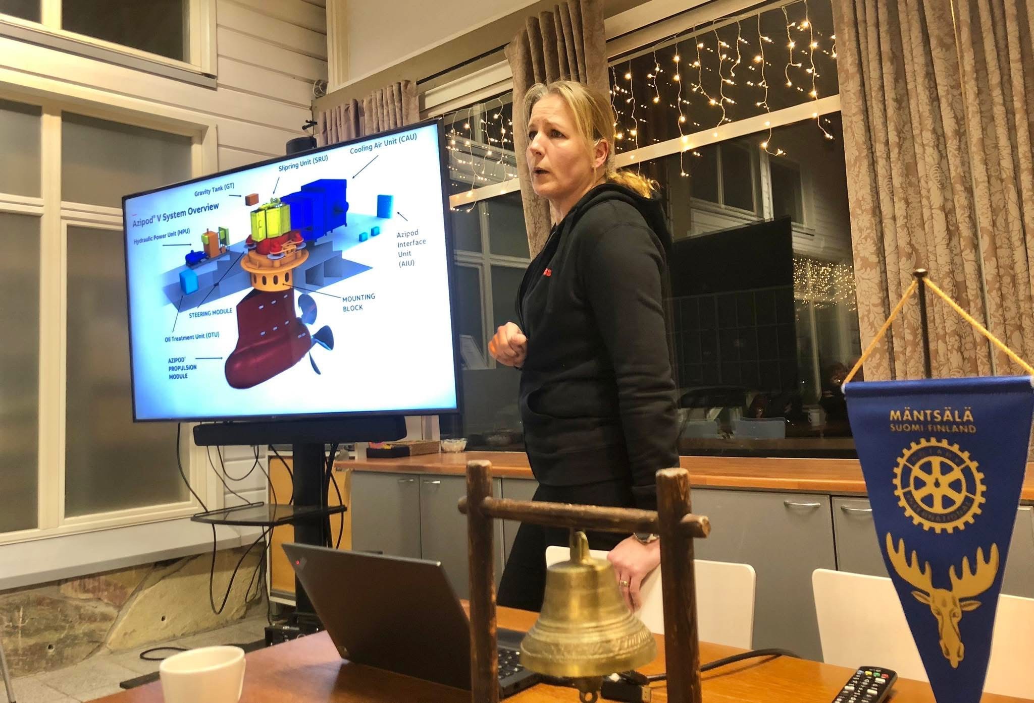 Ke 21.1.2026 Merenkulun sähköistymisestä kertoi meille ABB:n Monika Huotari. Isäntänä klubi-illassa oli hänen isänsä Jarmo Mäkeläinen. 90 prosenttia maailman tavaraliikenteestä kulkee meritse ja laivojen sähköistyminen on jo ilmastonkin kannalta tärkeää. Monika esitteli meille Azipod-moottorijärjestelmiä, joita käytetään isoista huvijahdeista aina Icon- luokan aluksiin. Azipod on potkurijärjestelmä, joka kääntyy 360 astetta ja laivaa voi tehokkaasti ohjata mihin suuntaan tahansa. Klubi-illassa oli tänään 21 osallistujaa