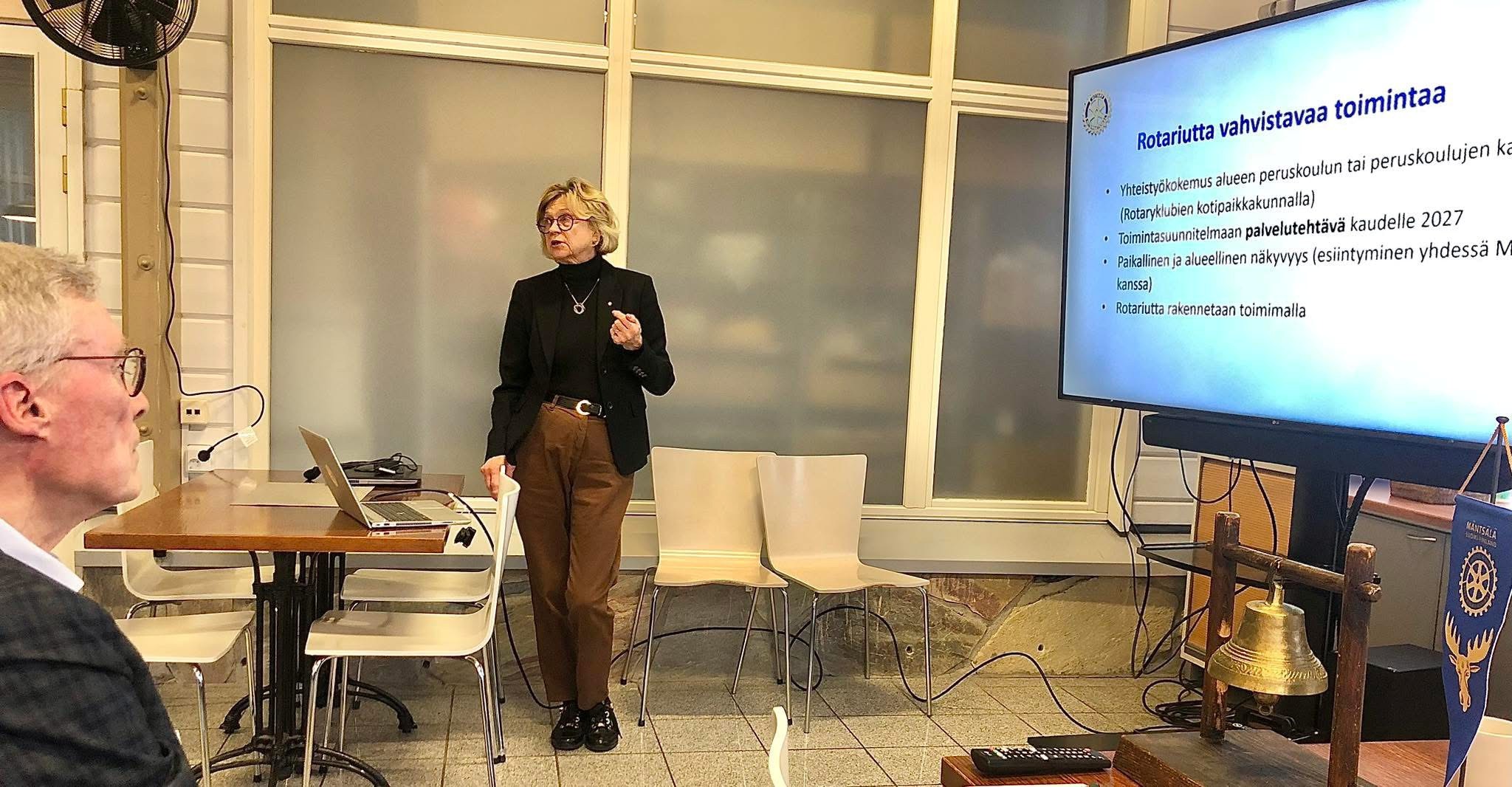 25.3.2026 Rotarypiirimme apulaiskuvernööri Ritva Ohmeroluoma esitteli tänään Nuori Mieli -koulutusta. Koulutuksella puututaan nuorten pahoinvointiin ja kohderyhmänä ovat lähinnä nuorten vanhemmat. Nuori Mieli on Rotarypiirin yhdessä Mieli ry:n kanssa alullepanema koulutus, joka aloitettiin vuonna 2023. Moni rotaryklubi on toteuttanut koulutusta, toiset useammankin kerran ja yhdessä esim. seurakuntien, tukijärjestöjen tai yrittäjien kanssa. Rotaryklubeille Nuori Mieli on palvelutehtävä paikallisten nuorten tukemisessa. Itse kurssituksen hoitavat Mieli ry:n kouluttajat. Klubi-illassamme oli aistittavissa positiivista suhtautumista koulutukseen ja asia siirtyy päätöksenteossa eteenpäin. Illassa oli apulaiskuvernöörin lisäksi 13 rotaria.