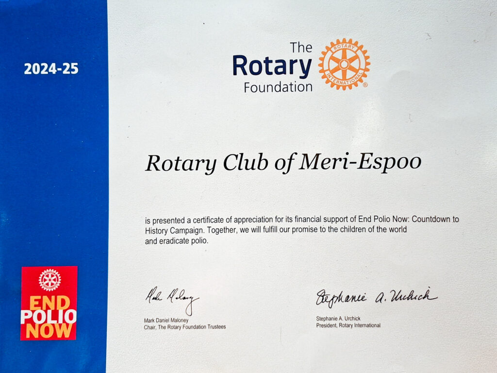 Meri-Espoon Rotaryklubille myönnettiin rotarypiirin 1420 End Polio Now illallisella 24 . lokakuuta tunnustus End Polio Now projektille suunnatuista lahjoituksista.