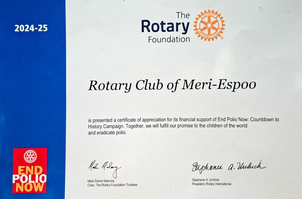 Meri-Espoon Rotaryklubille myönnettiin rotarypiirin 1420 End Polio Now illallisella 24 . lokakuuta tunnustus End Polio Now projektille suunnatuista lahjoituksista.