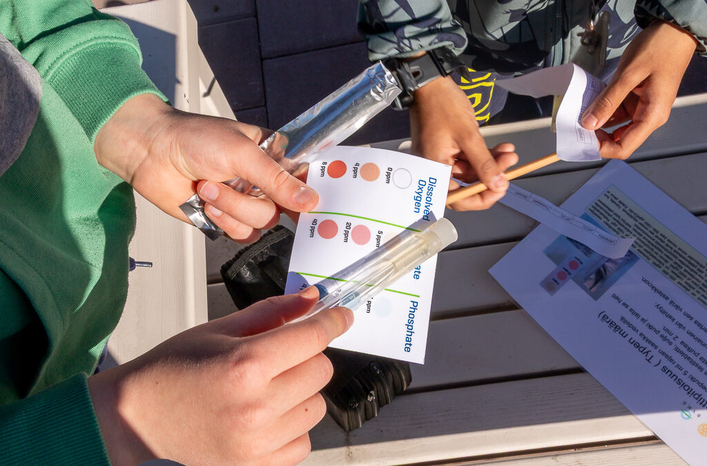 Oppilaat aloittivat tutkimuksen veden lämpötilan mittauksella ja ottivat vesinäytteet mm ph:n sekä happi-, fosfori- ja typpipitoisuuden mittausta varten. Oppilaat tekivät mittaukset repussa olevien ohjeiden mukaisesti ja käyttivät testitabletteja ja värikarttoja mittauksien teossa.
