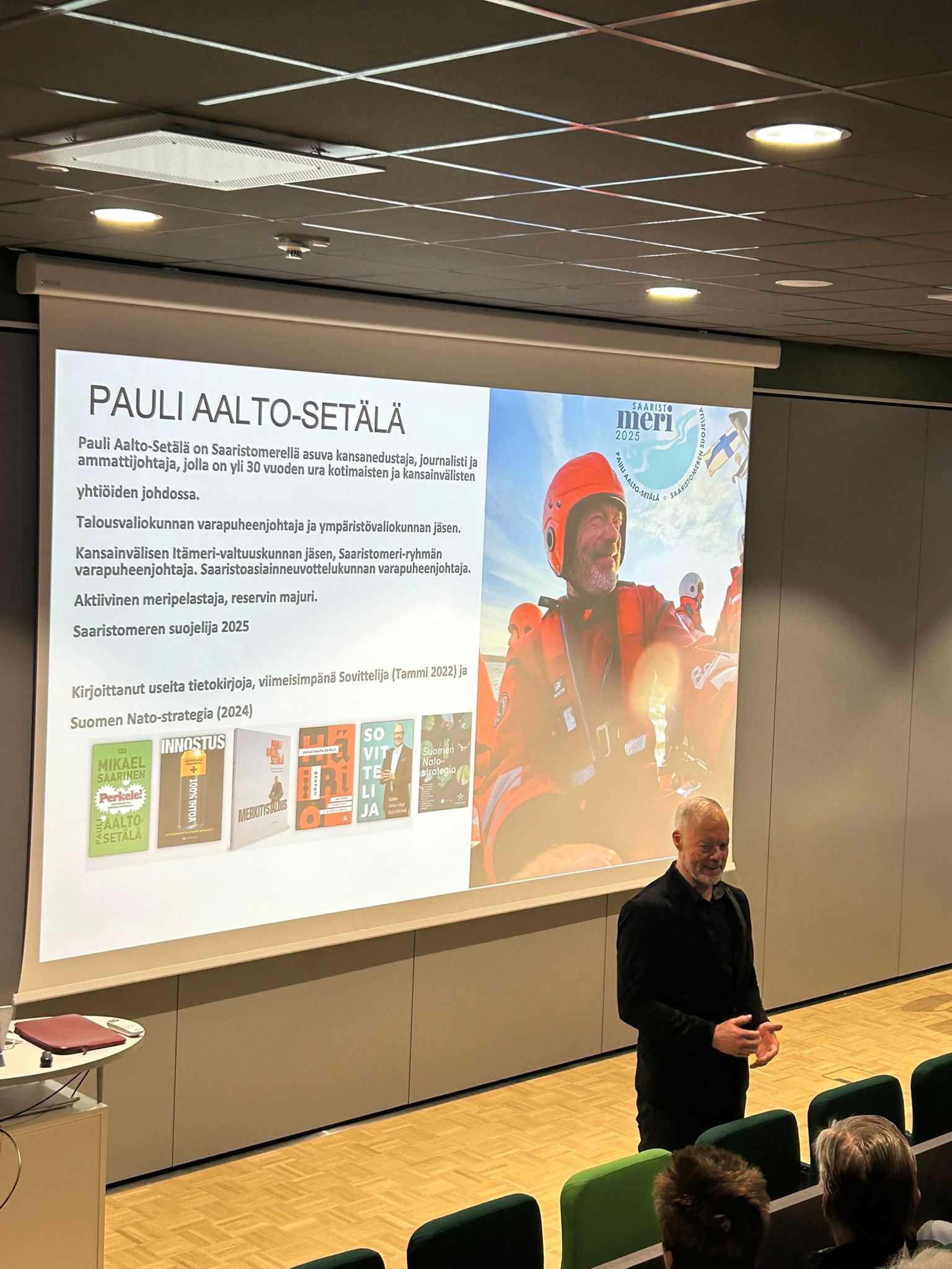 Kansanedustaja Pauli Aalto-Setälä oli saapunut Nousiaisten Henrikin yhtenäiskoulun auditorioon puhumaan Itämeren tilasta ja turvallisuudesta. Tilaisuutta oli etukäteen markkinoitu lehdistölle, koululle ja kunnalle ja seurakunnalle ja lähiseudun rotaryklubeille. Saimmekin aika lailla hyvän joukon kuulemaan laadukasta esitelmää.