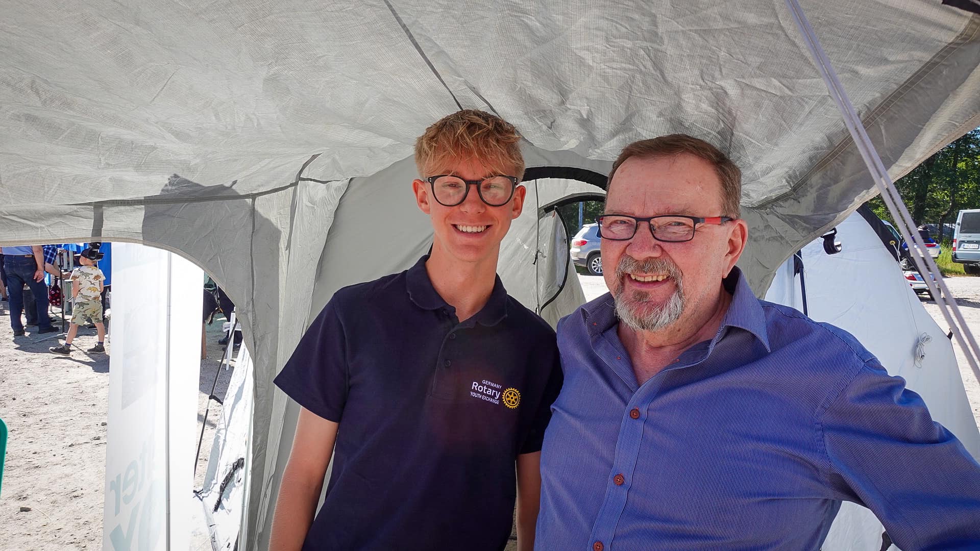- Tuore vaihto-oppilaamme Saksasta, Fabian Weber, ja presidenttimme Hannu Härkönen ShelterBox-teltan suojassa