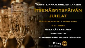 Illan ohjelmassa piirikuvernööri Matti Hakoilan juhlapuhe. Nuorten näkemyksen antaa alikersantti Selja Eskola. Vaihto-oppilaamme Mackenzie Clarke Kanadasta esittäytyy ja säestää Maamme Laulun. Lisäksi hauskaa yhdessäoloa ja tanssia Presidentin linnan juhlien tahtiin ison screenin ääressä.