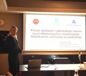 Erittäin mielenkiintoisessa esityksessään Kauppila tarkasteli Kiinan vaikutusta erityisesti arktisella alueella: mitä Kiina tavoittelee Arktiksella, miltä se näyttää Yhdysvaltojen näkökulmasta ja mitkä ovat jännitteen mahdolliset vaikutukset pienille arktisille maille, kuten Suomelle.