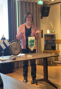 Jäsenemme Elsi Tuominen kertoi klubikokouksessa erittäin monipuolisesti naisten vapaaehtoisesta maanpuolustuksesta Suomessa. Elsi toimii itse Espoon Maanpuolustusnaiset ry:ssä, mutta hän kertoi myös naisten vapaaehtoisen maanpuolustuksen historiasta Lotta Svärd-järjestöstä alkaen sekä alan nykyisistä valtakunnallisista järjestöistä. Lisäksi saimme kuulla Maanpuolustuskoulutusyhdistyksestä, joka järjestää varsin monipuolista koulutusta erilaisten kriisien varalta. Kurssit ovat kaikille avoimia ja erittäin suosittuja.
