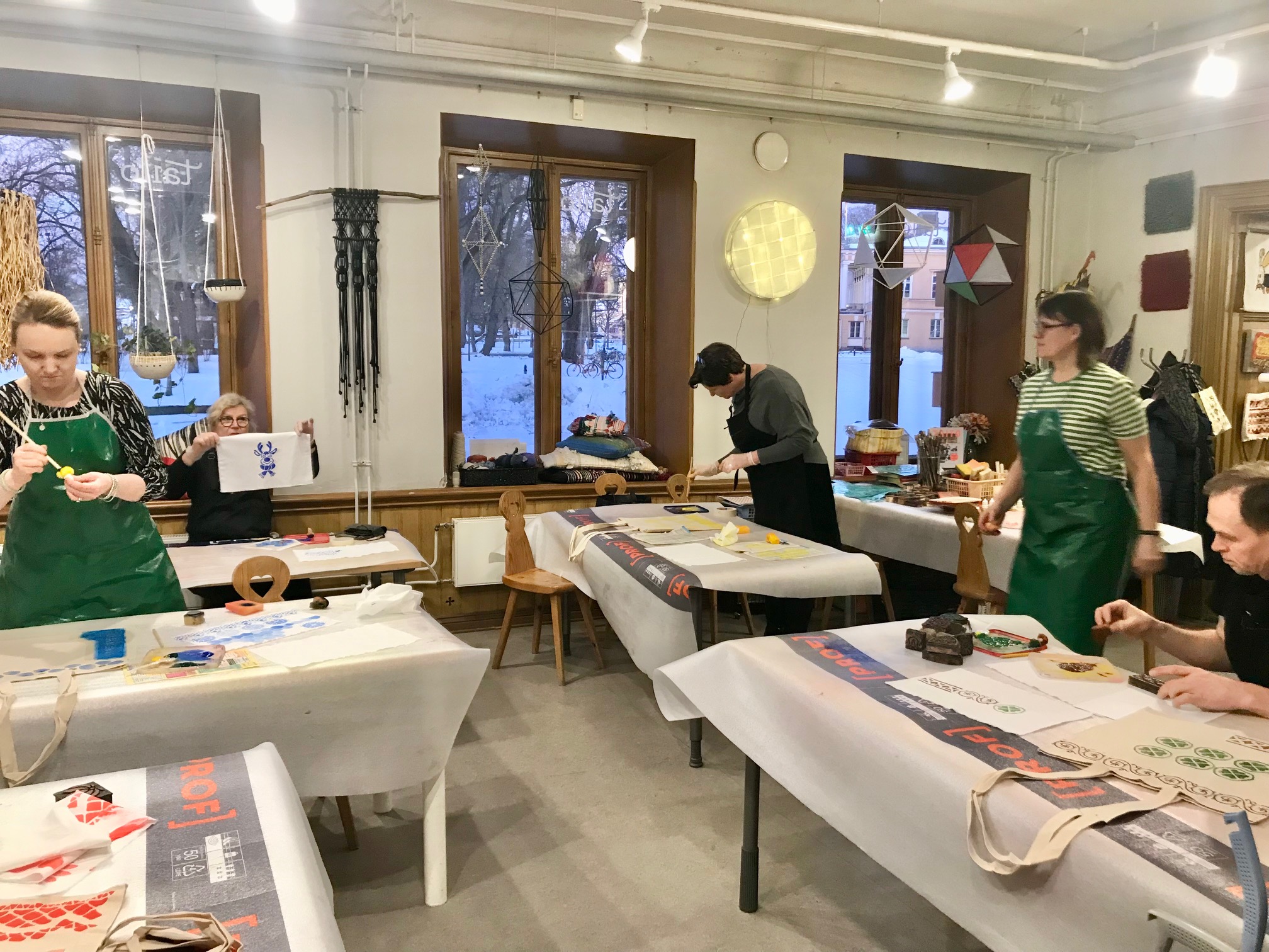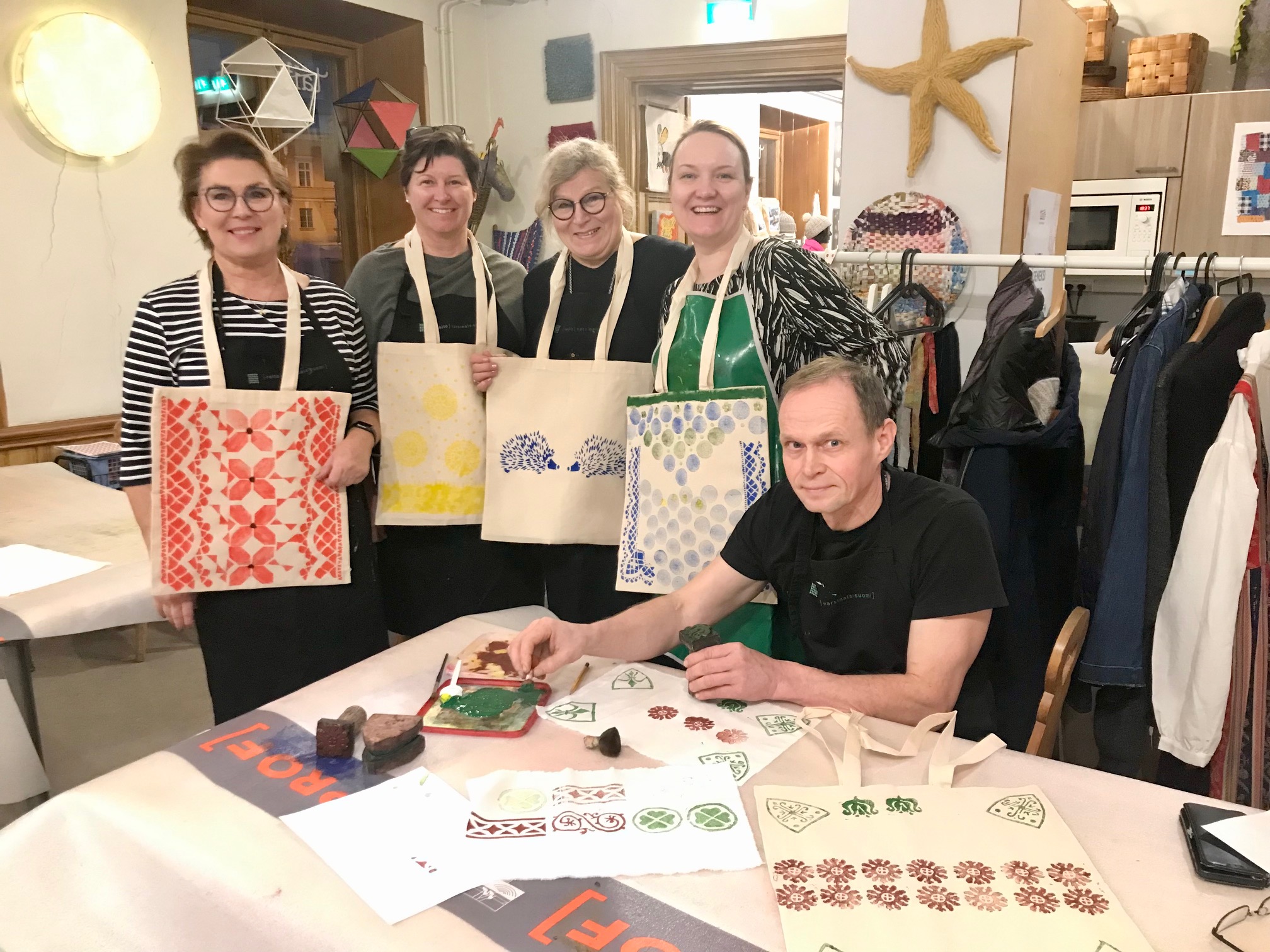 Aboanovalaisia luovalla päällä; painoimme itsellemme kassit Turun Taitokeskuksessa, Brinkkalan talossa. Opastajana taitava Elina Helminen. Mukavaa oli.