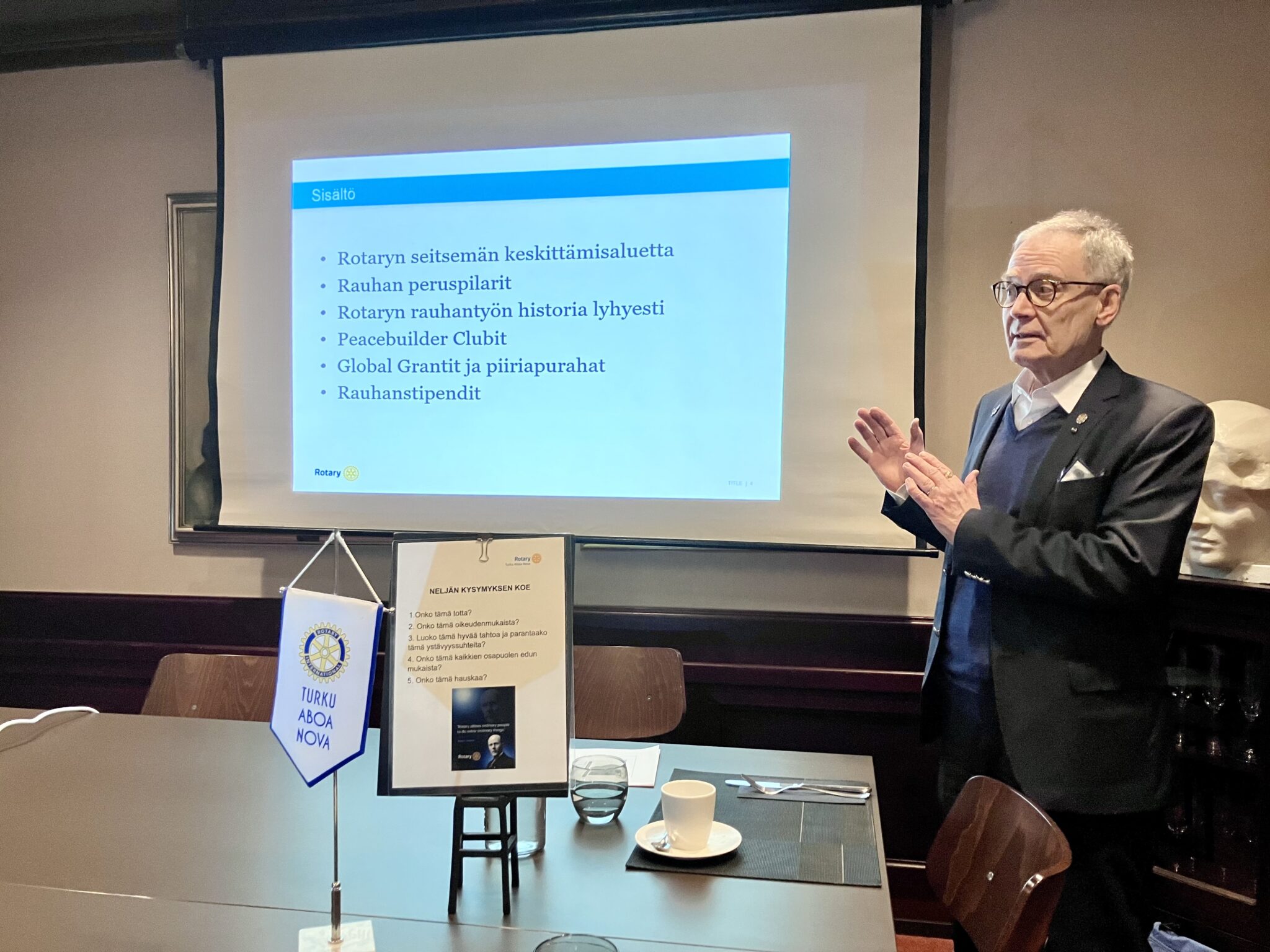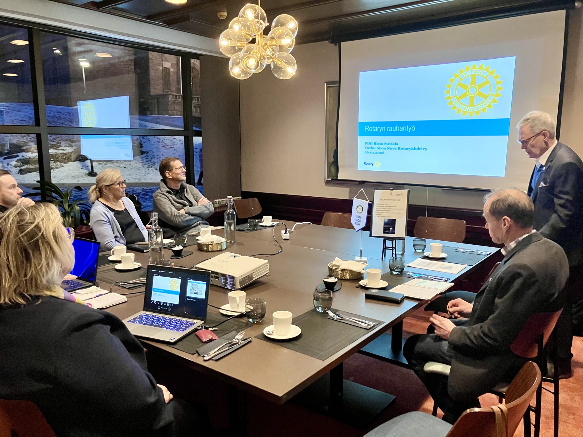 Tämän viikon kokouksessamme oli PDG Risto Suviala Samppalinnan klubista kertomassa Rotaryn rauhantyöstä. Jo vuonna 1914 9. klubin julkilausuma oli: Kaikkien rotaryklubien tulisi puhua rauhan puolesta. 1945 Rotary oli perustamassa YK:ta San Franciscossa. Kansojen välistä yhteisymmärrystä lisäävät nykyisin mm. nuorisovaihto (vuosittain noin 8.000 nuorta), Global Grandit, maailmankonventiot ja Rotary Peace Centerit.