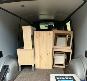 ahertamisen jälkeen kaikki tuotteet kootuksi ja edelleen toimitettavaksi kohteisiinsa. Kiitos Aquariuksen, saimme koota kaikki tuotteet pöytien päällä, eikä tarvinnut kontata lattialla pikku ruuvien ja muiden osien perässä. Ennen toimitusta olimme teettäneet verhot valmiiksi ja matot leikattuna sopivaan kokoon.