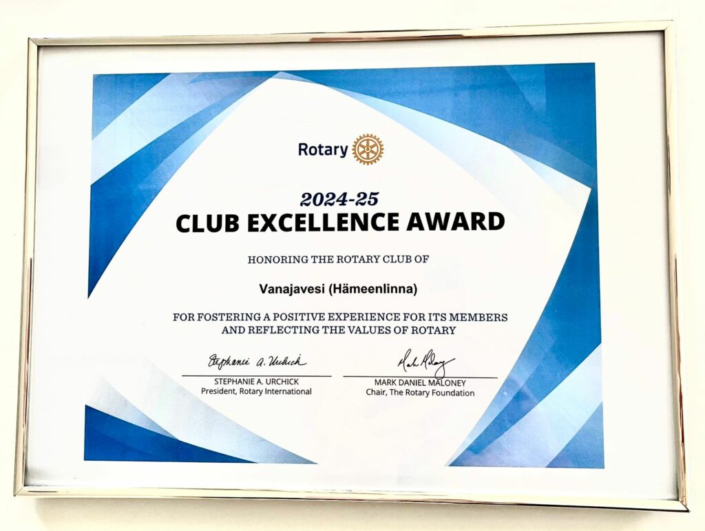 Rotarivuoden 2024-2025 toiminnasta ja tavoitteiden toteutumisesta saimme Club Excellence Award-tunnustuksen, jonka olivat allekirjoittaneet viime vuoden Rotary International presidentti Stephanie U. Urchick ja Rotary Foundation puheenjohtaja Marc Daniel Maloney.